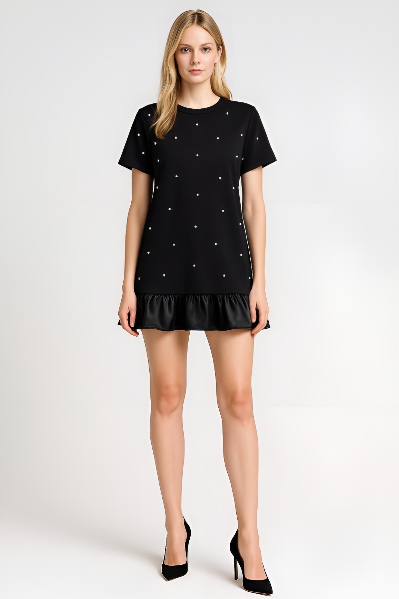 Şıklığı ve enerjiyi bir araya getiren bu siyah mini elbise, inci görünümlü zarif noktalarla süslenmiş tasarımı sayesinde sofistike bir ışıltı...