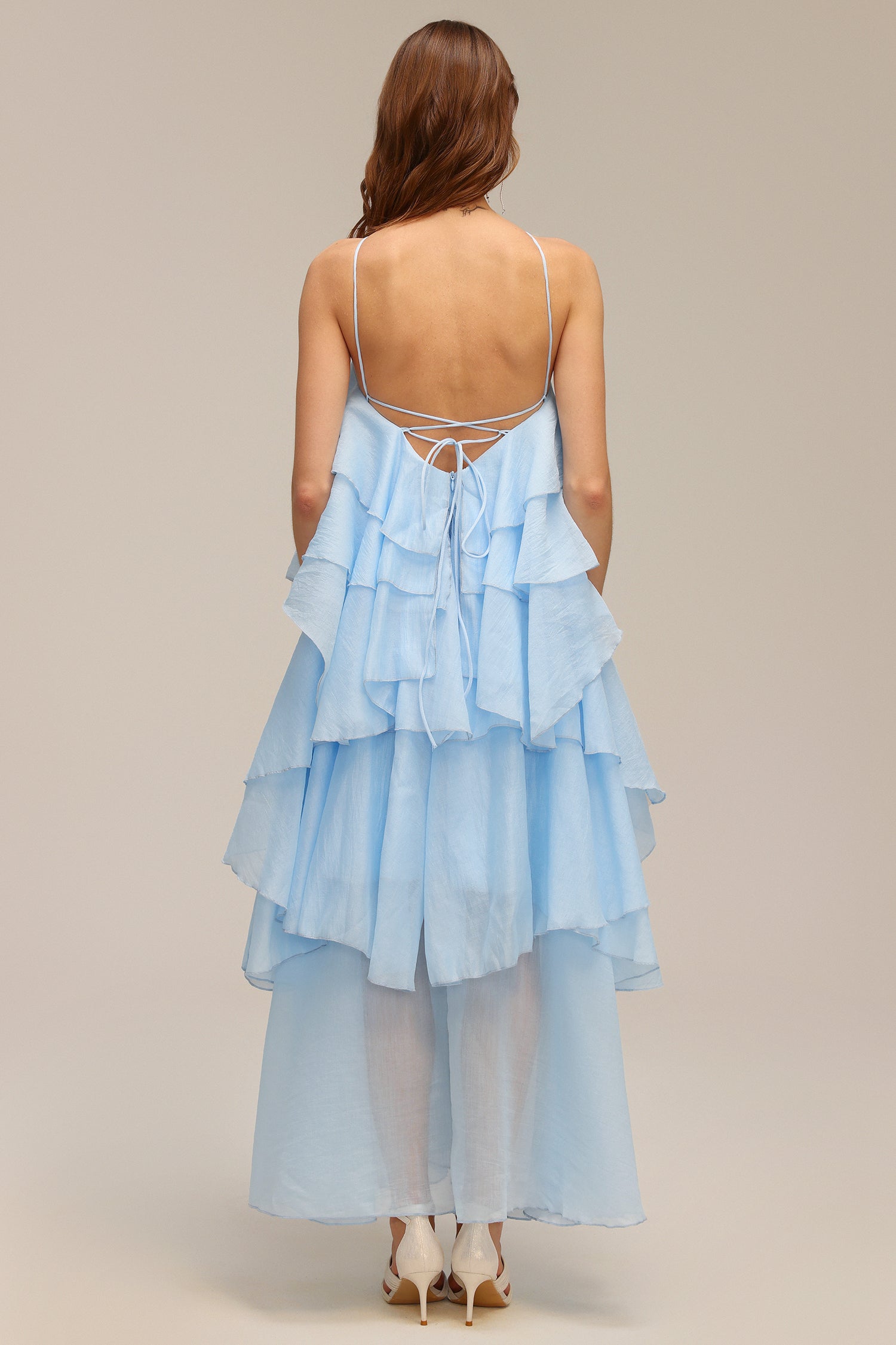 Masalsı bir görünüme sahip bu açık mavi elbise, halter yaka detayı ve kat kat dökümlü katmanlarıyla büyüleyici bir siluet sunar....