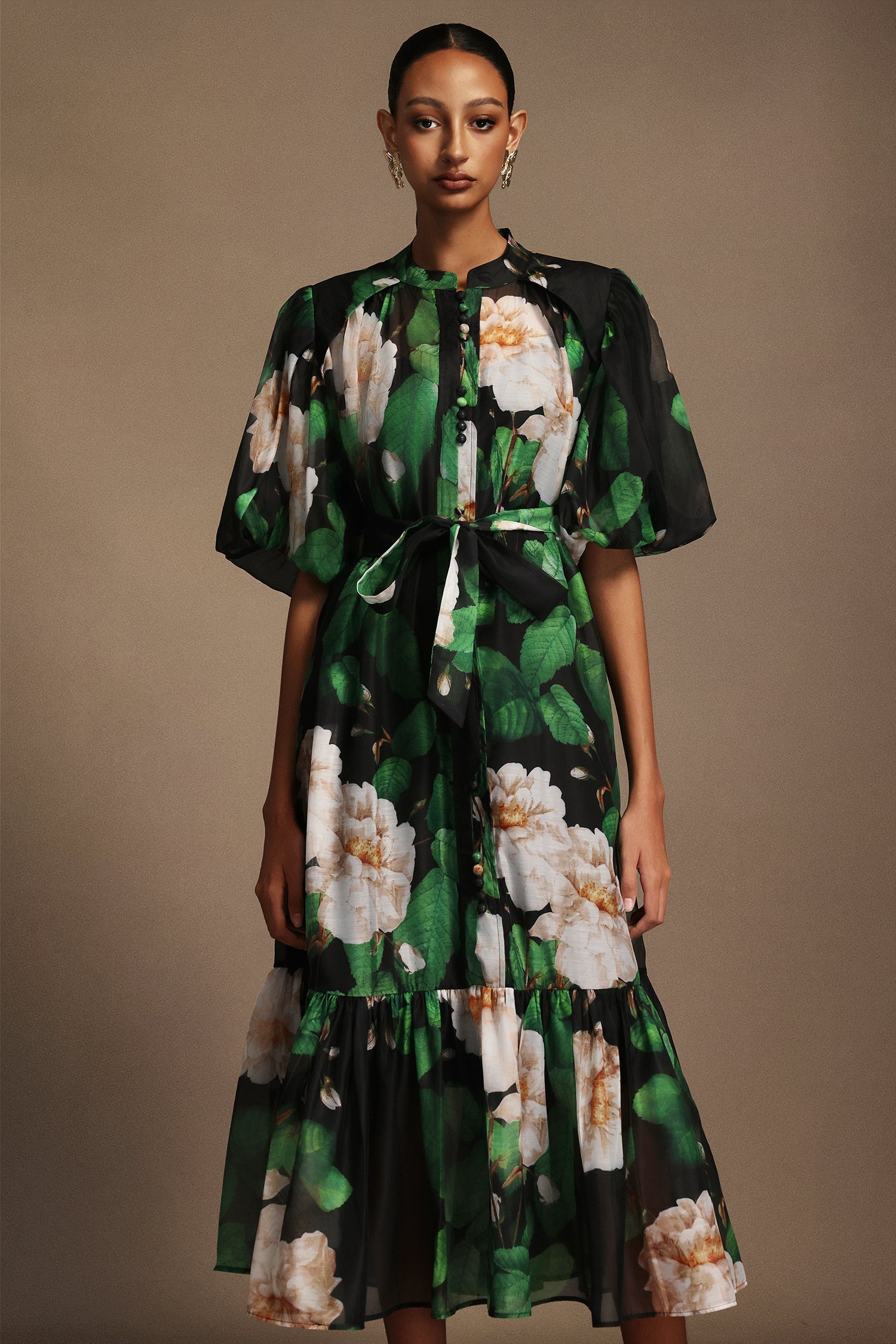 Zarafeti ve modern dokunuşu bir araya getiren bu siyah elbise, büyük boyutlu yeşil ve beyaz çiçek desenleriyle sofistike bir görünüm...