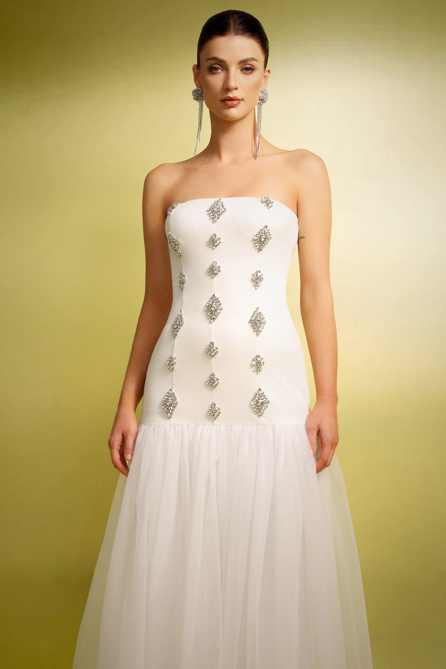 Masalsı bir zarafet sunan Celestialé Elbise, modern feminenliği romantik detaylarla buluşturur. Straplez formu zarif bir siluet yaratırken, gövde boyunca uzanan... Devamını oku