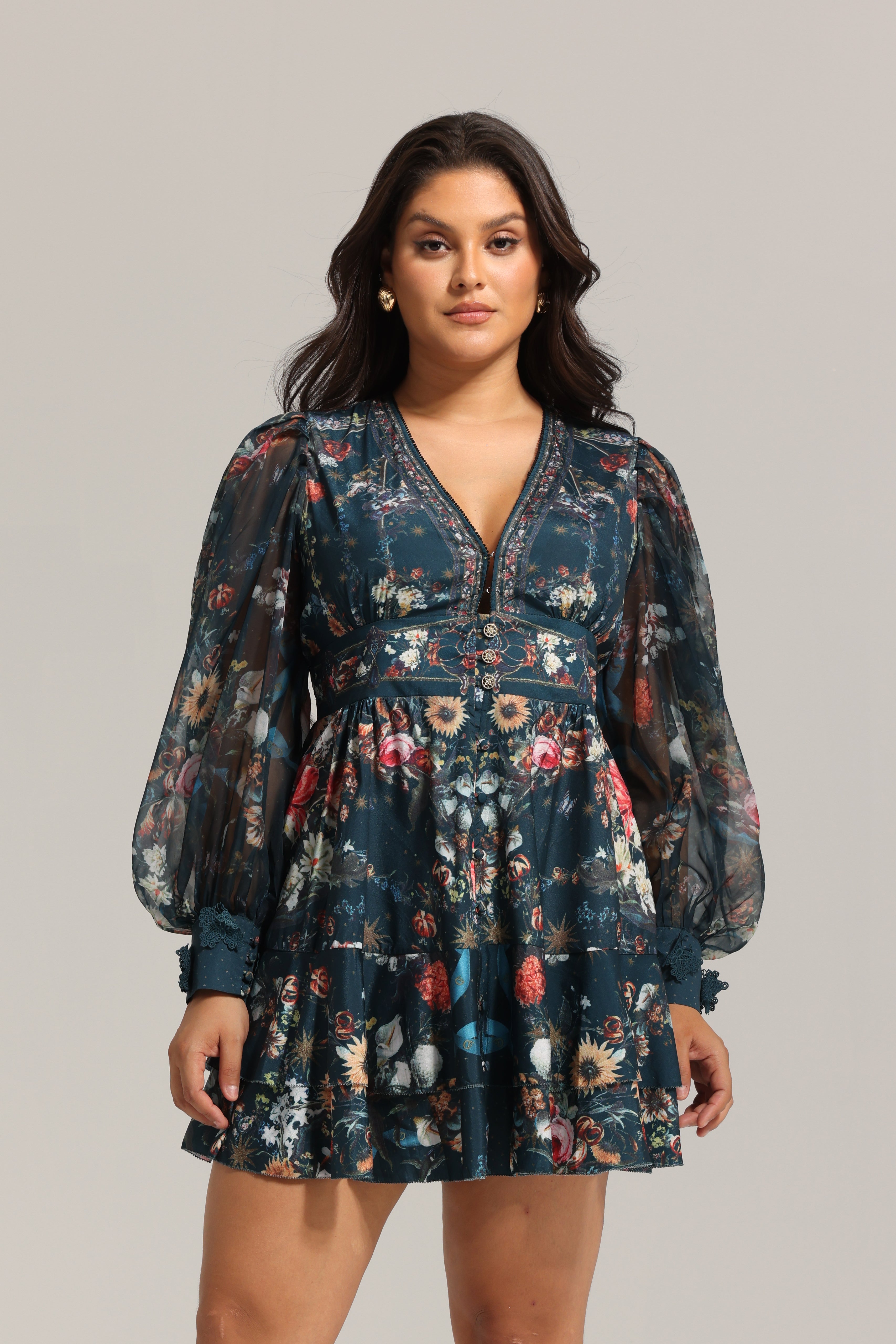 Romantik detaylarla modern şıklığı buluşturan bu çiçek desenli mini elbise, feminen ve enerjik bir siluet sunuyor. Transparan puf kollar zarif...