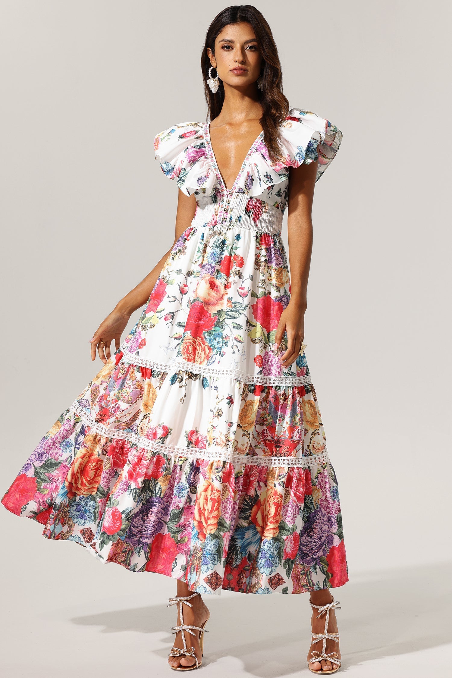 Canlı çiçek desenleriyle baharın enerjisini yansıtan bu maxi elbise, feminen ve romantik bir duruş sunar. Derin V yaka kesimi, fırfırlı...