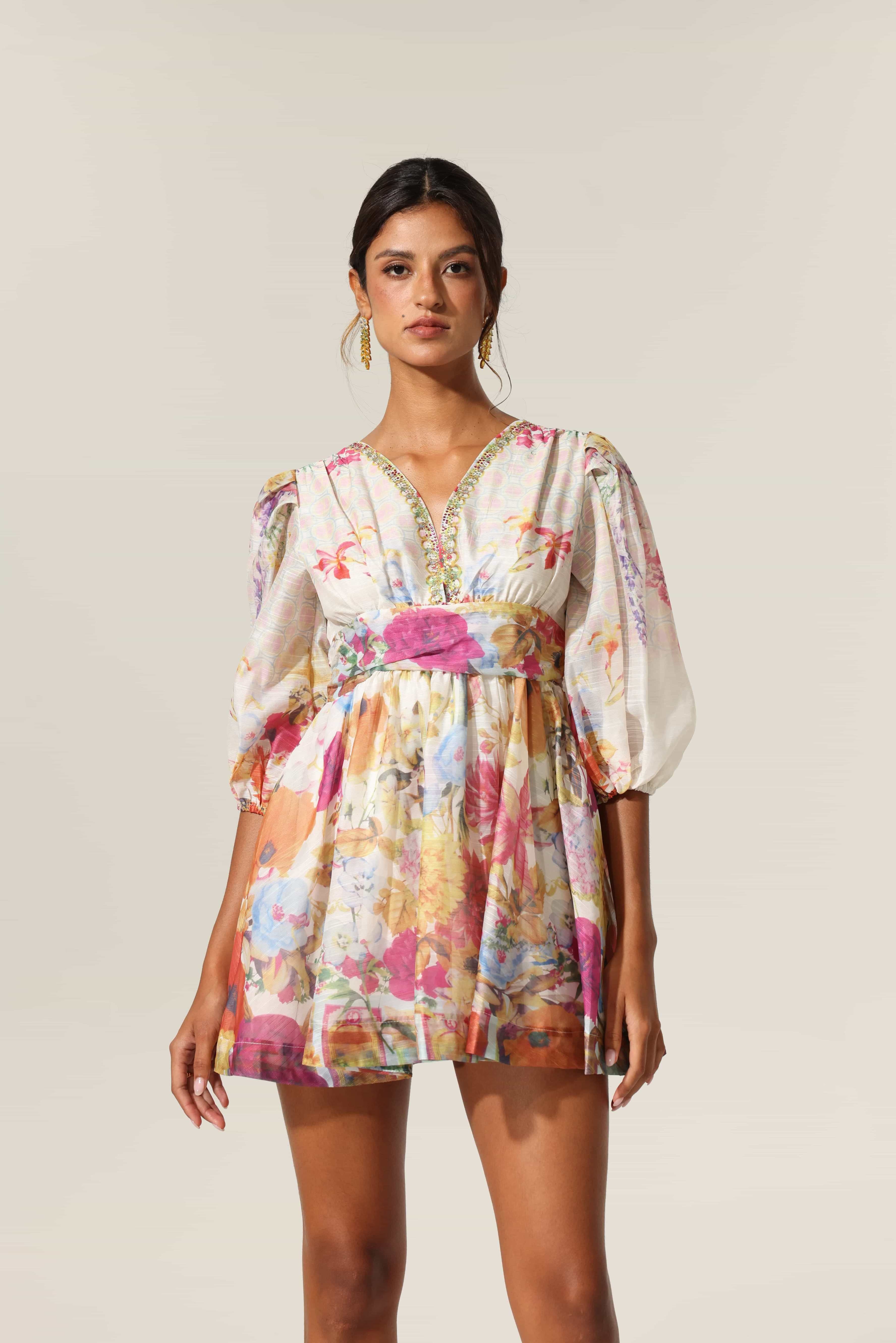 Canlı çiçek desenleriyle öne çıkan bu mini elbise, belden oturtmalı kesimi, dökümlü balon kolları ve yaka kısmındaki zarif işlemeleriyle dikkat...