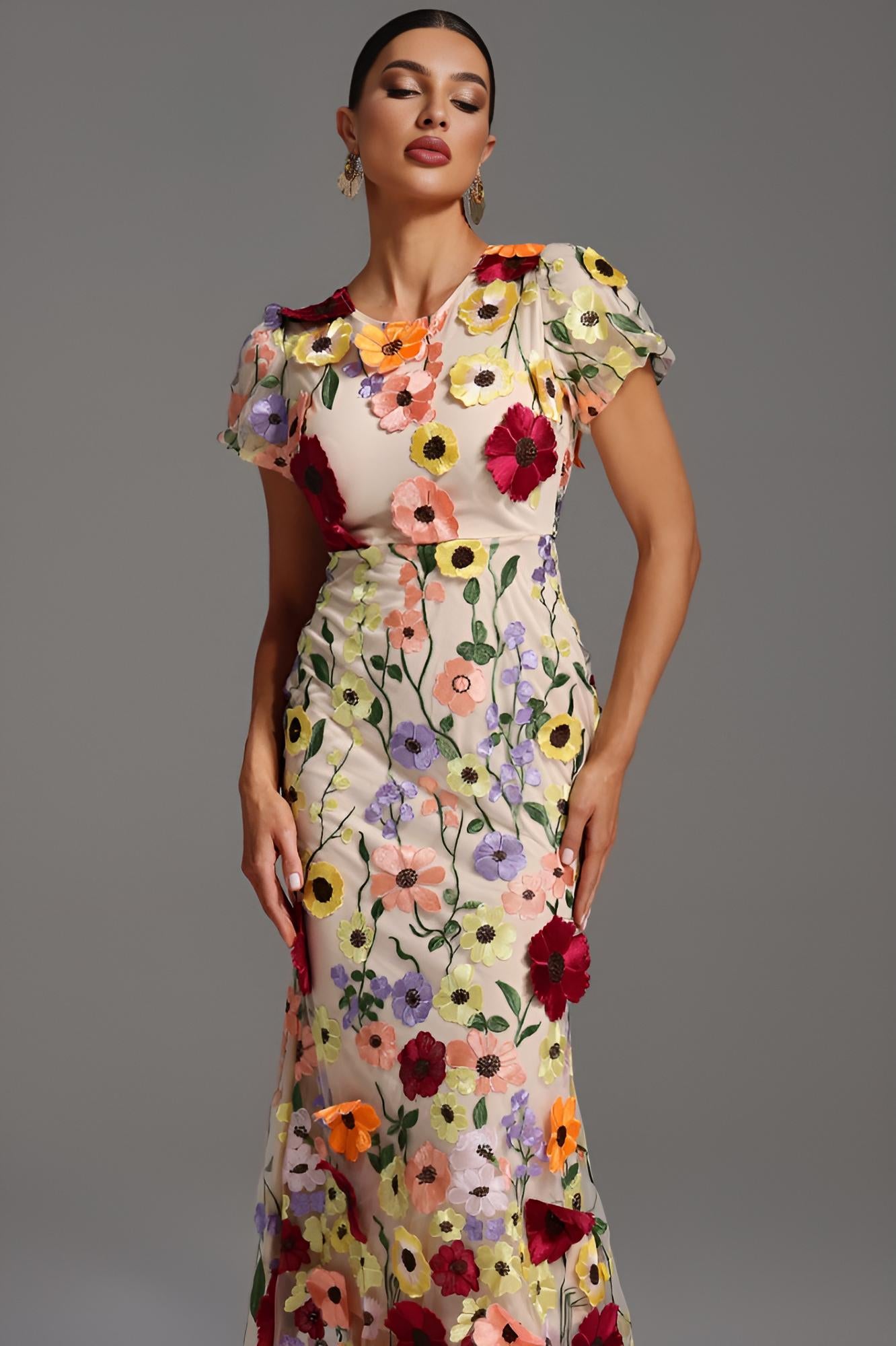 Romantik ve zarif tasarımıyla öne çıkan bu midi elbise, canlı 3D çiçek işlemeleri ile süslenmiştir. Çiçek açan bir bahçenin tüm...
