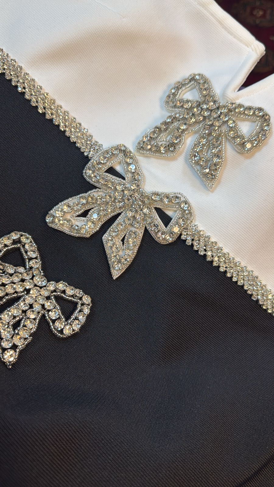 Detay: Kristal taşlarla süslenmiş üç fiyonk aplikesi