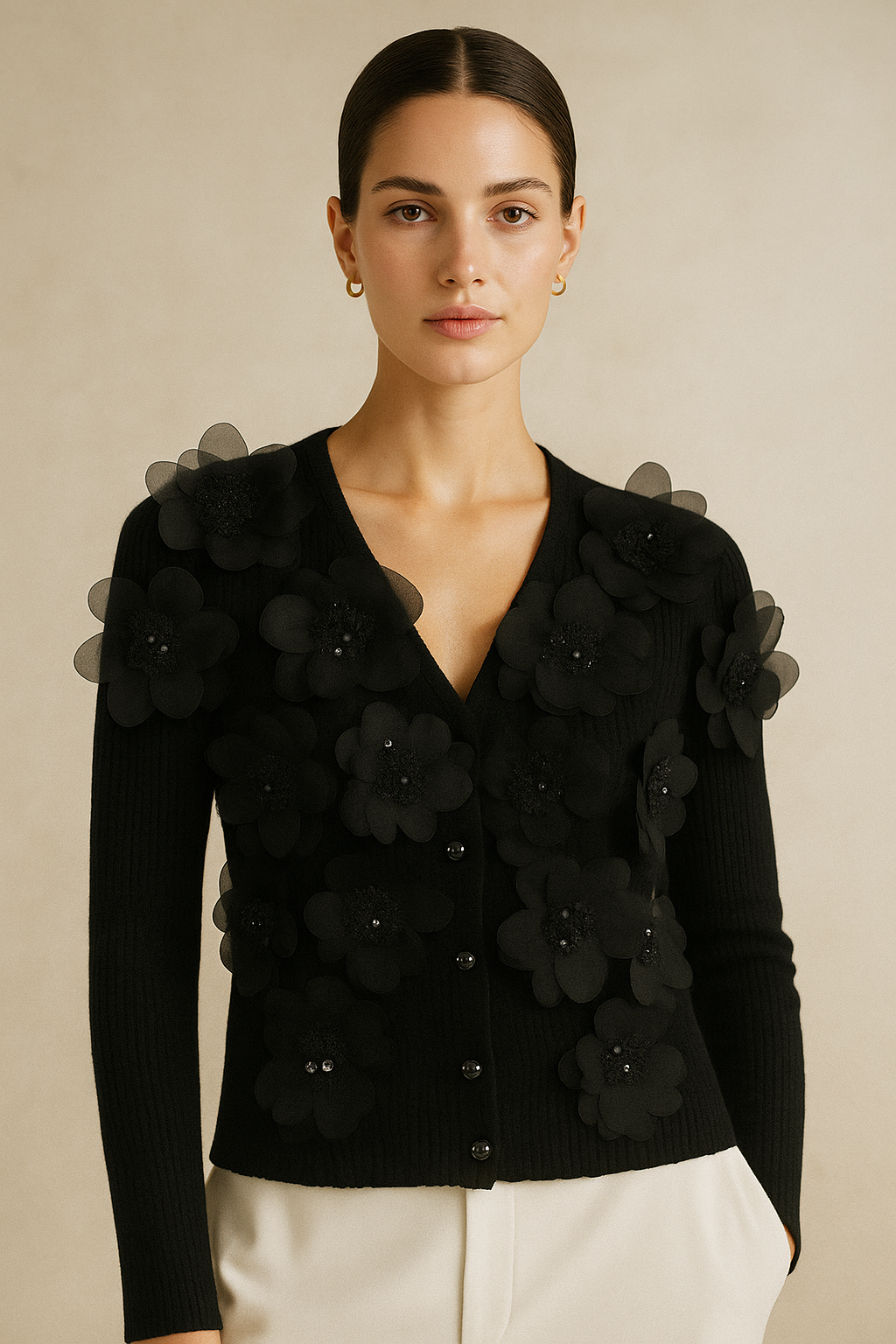Koyu tonların ihtişamını yansıtan Nightfall Çiçek İşlemeli Üst, zarif ve göz kamaştırıcı detaylarıyla öne çıkar. Kat kat siyah çiçek yaprakları...