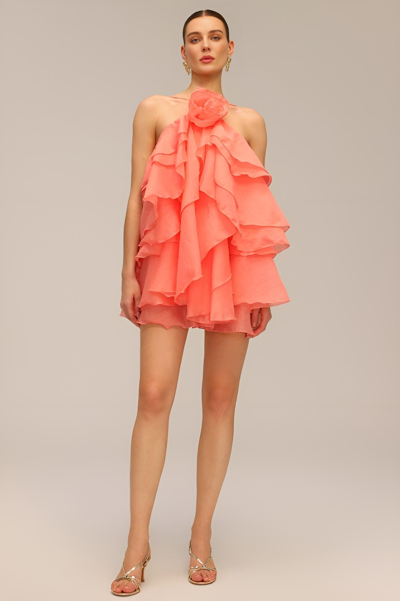 A playful and elegant mini dress in coral pink, featuring cascading ruffles, a high halter neckline, and a statement floral... Devamını oku