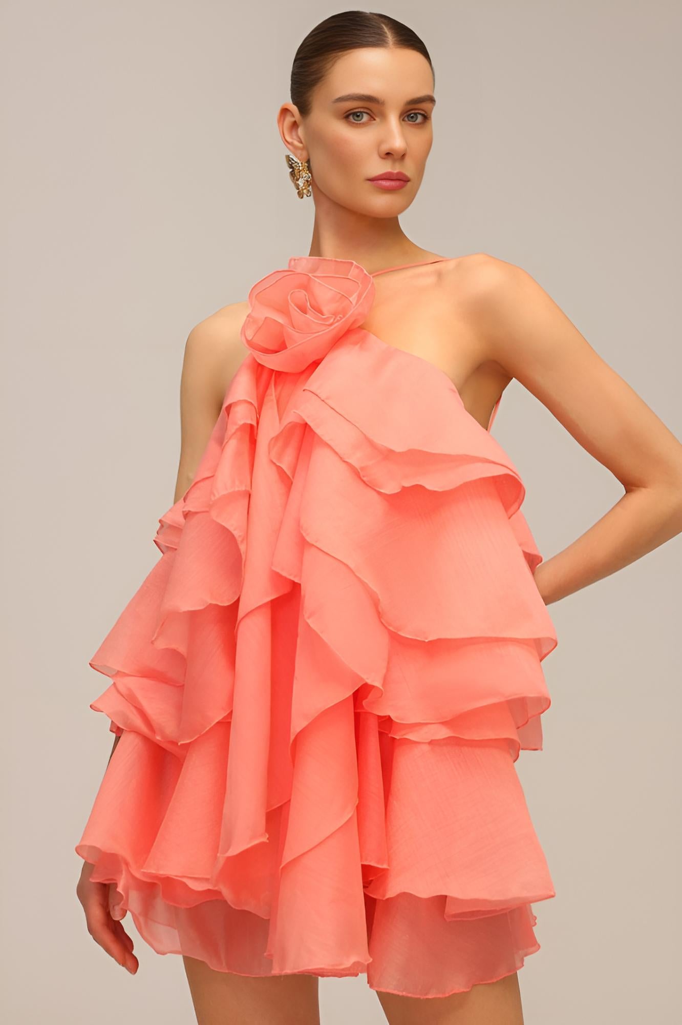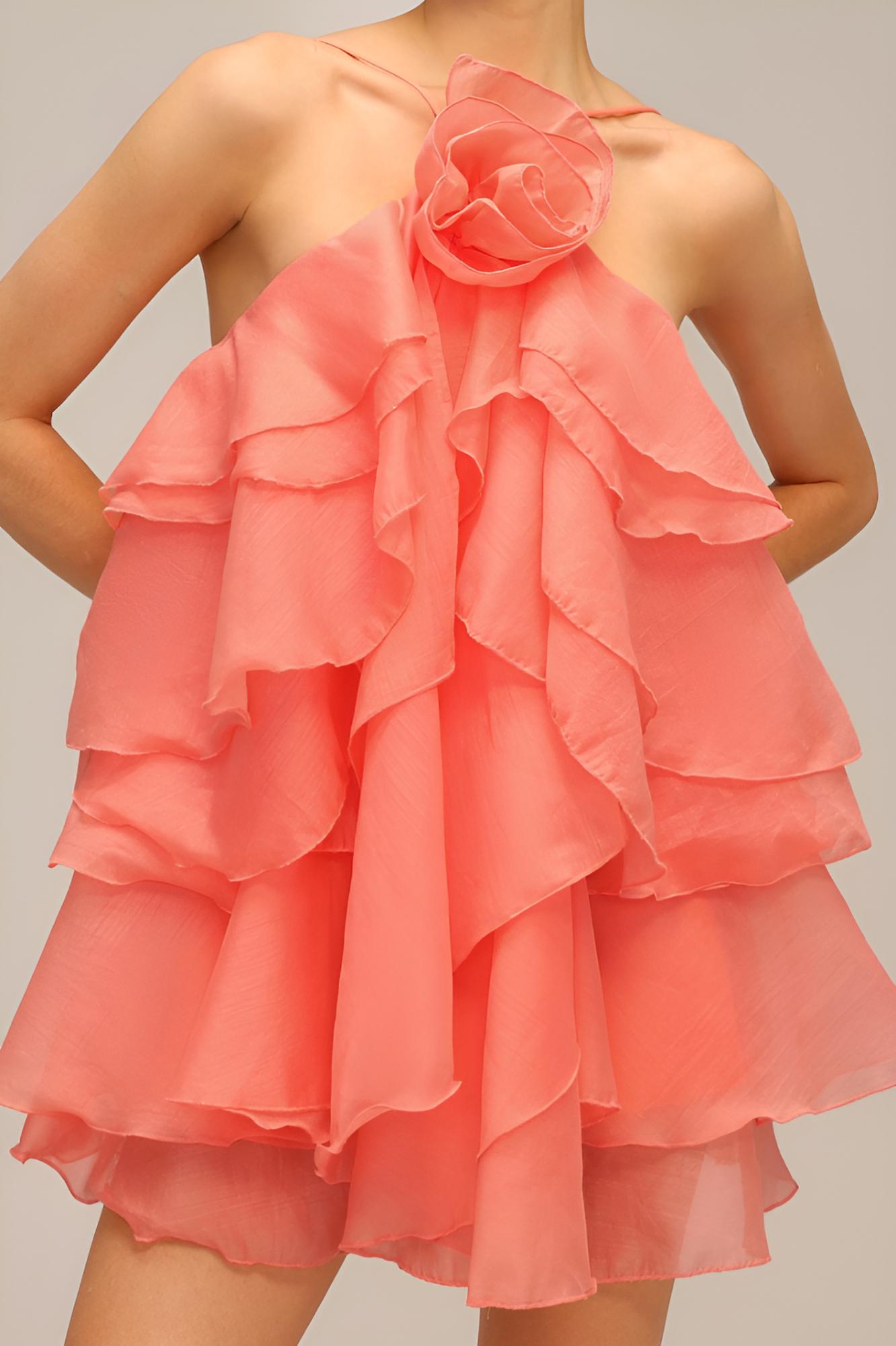 Mercan pembe tonuyla dikkat çeken bu eğlenceli ve zarif mini elbise, kat kat dökümlü volanları, yüksek halter yaka detayı ve...