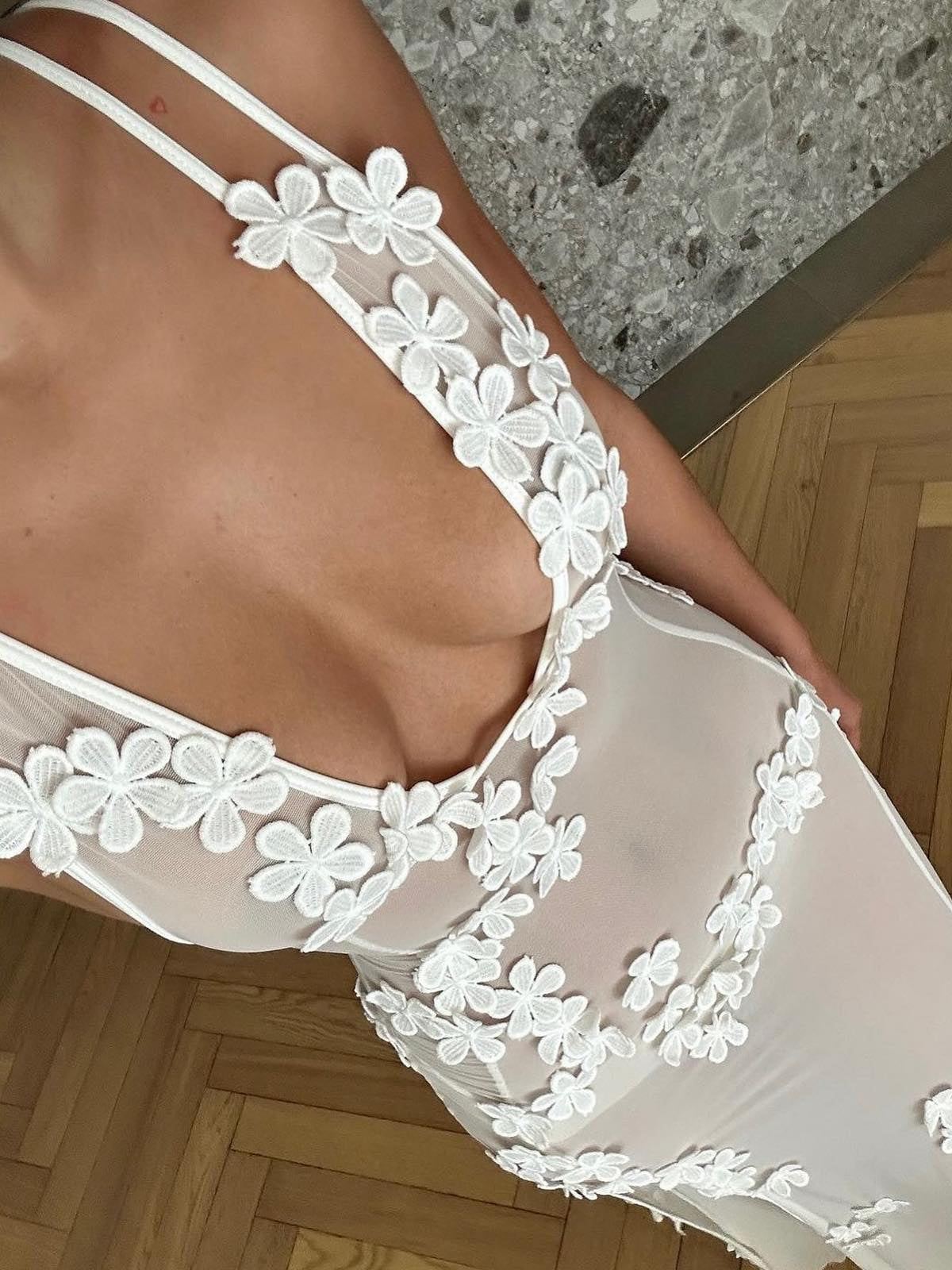 Transparan Çiçekli Uzun Elbise